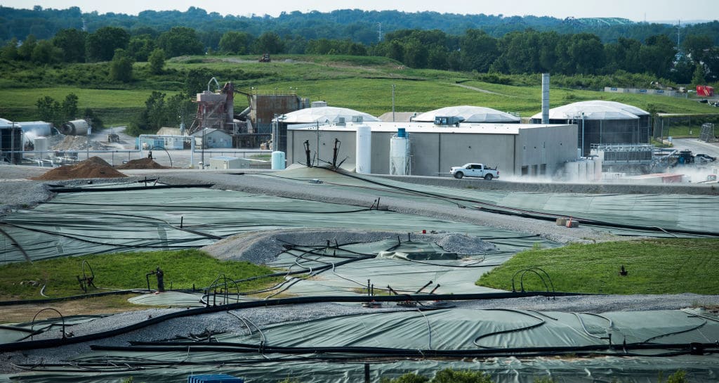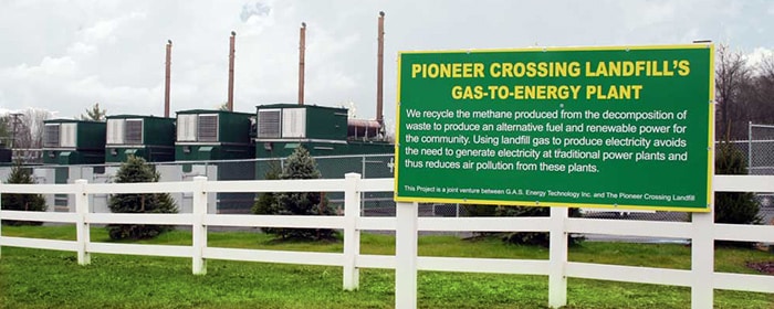 The Pioneer Crossing Landfill in Berks County, Pennsylvania uses methane gas, a byproduct of the decomposition of waste, to produce electricity for the local utility company. J.P. Mascaro & Sons
