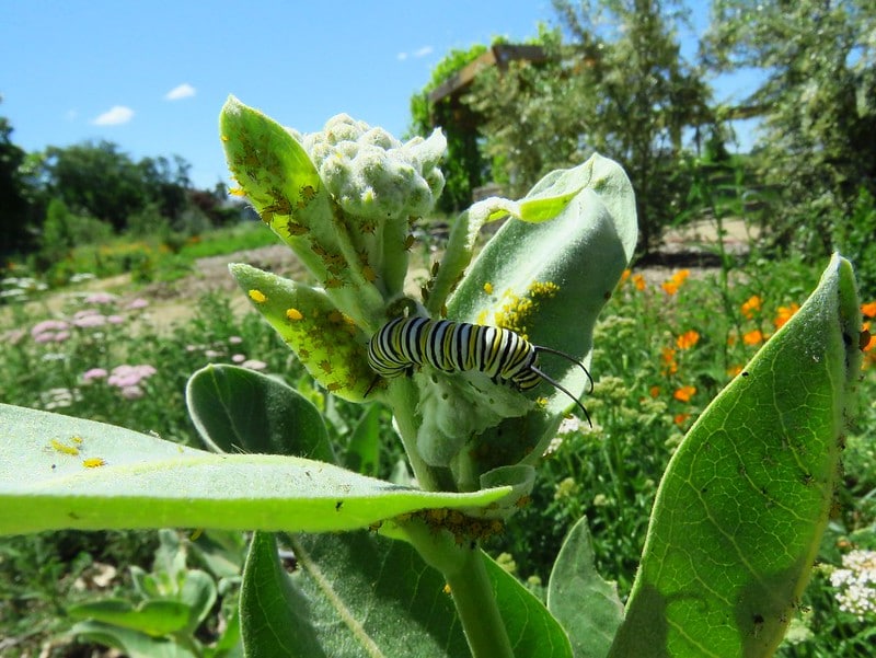 A monarch caterpillar on a native showy milkweed plant. Jim Wadsworth / California Native Plant Society / CC BY 2.0