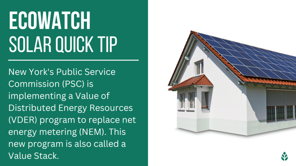 Like many other states, NY is moving away from net energy metering. The Public Service Commission (PSC) is implementing a Value of Distributed Energy Resources (VDER) program to replace net energy metering (NEM). This new program is also called a Value Stack.