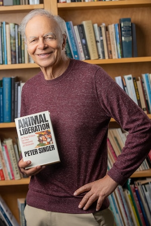 Peter Singer with a previous version of Animal Liberation, on Sept. 22, 2022. Derek Goodwin Photography