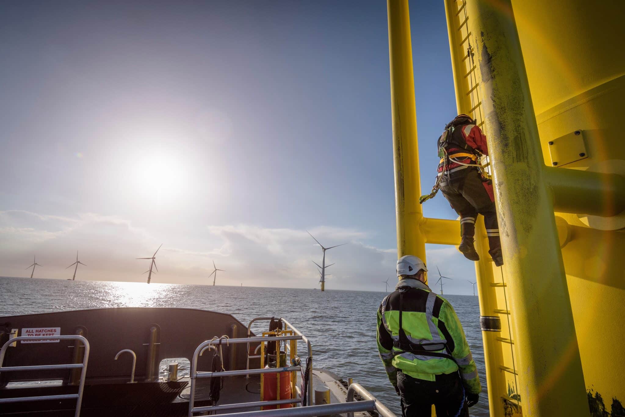 A wind power technician works on an offshore turbine. Photo credit: Monty Rakusen / Image Source / Getty Images