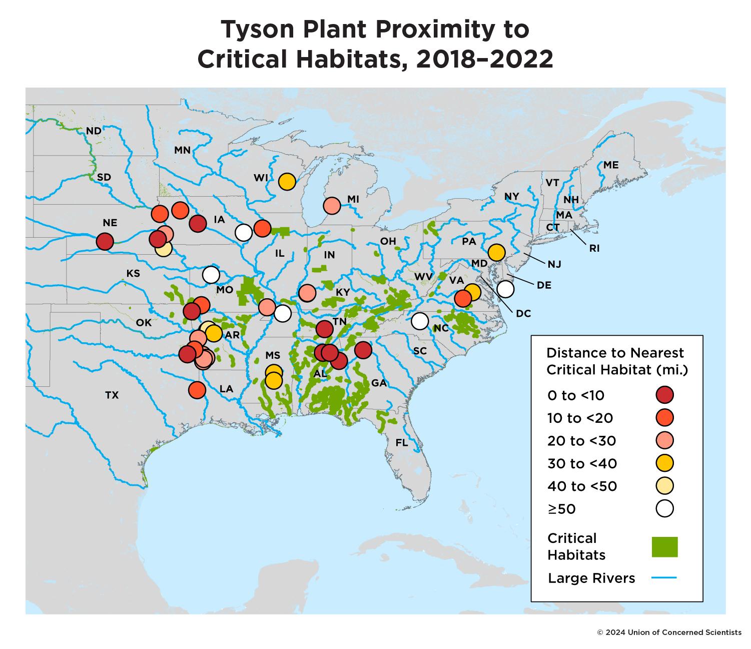 “Pollution from these plants also raises environmental justice concerns,” Stacy Woods, co-author of the report and research director for the Food and Environment Program at UCS, said in a press release. “We know from previous research that almost 75% of water-polluting meat and poultry processing facilities are located within one mile of communities that already shoulder heavy economic, health or environmental burdens. In mapping these plants, we found Tyson largely fit that pattern, with many plants located near communities where people live with more pollution, less socioeconomic and political power, and worse health compared to other areas of the United States.”