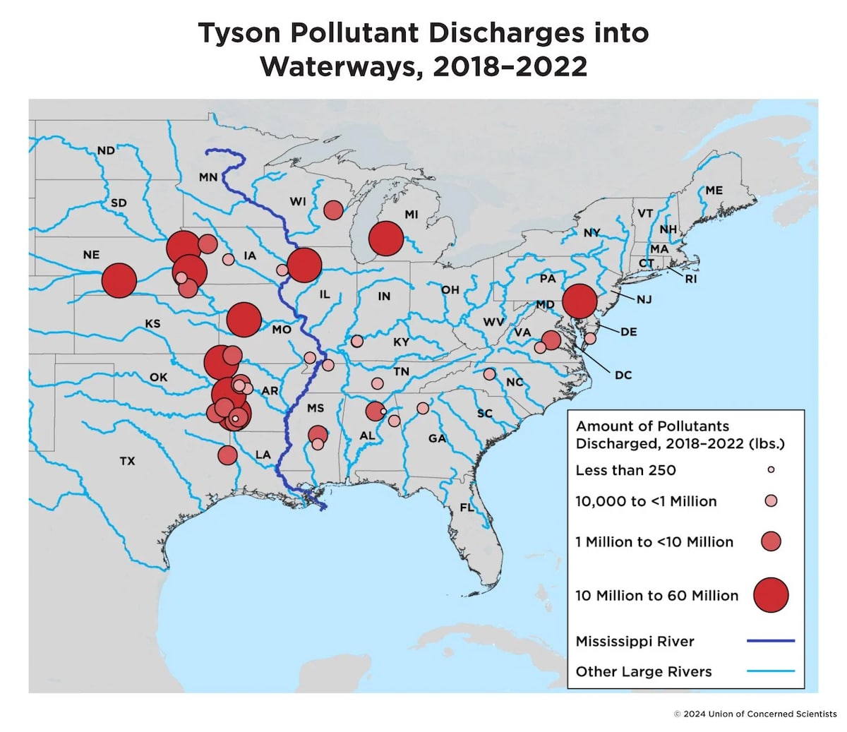 UCS analyzed publicly available data from the U.S. Environmental Protection Agency (EPA) and found that Tyson Foods processing plants released 371.72 million pounds of pollutants into waterways from 2018 to 2022. Half of the pollutants were dumped in waterways of Nebraska, Illinois and Missouri. The group published the findings in a report titled Waste Deep: How Tyson Foods Pollutes US Waterways and Which States Bear the Brunt.